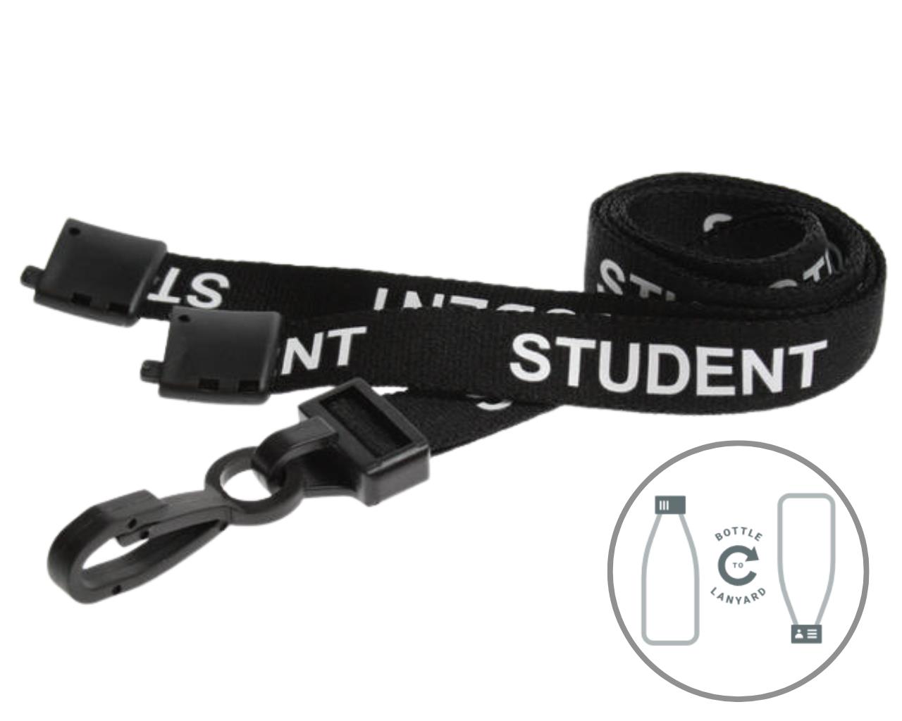 Our Black Student Lanyards are available with either a metal lobster clip or plastic J clip. Made from recycled plastic bottles (RPET) and packed in corn starch, each lanyard is 15mm in width, with the word “Student” pre-printed in white to ensure quick and secure identification.